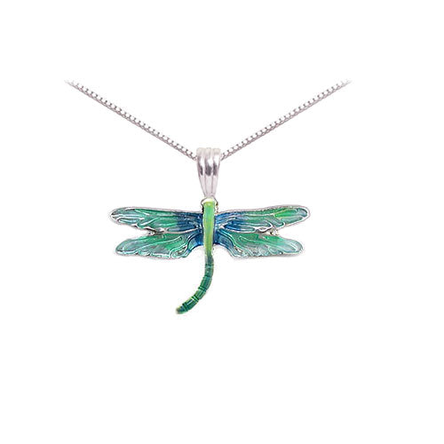 Lustrous translucent enamel make these popular blue green dragonfly post earrings designed by artist Marilyn Grame striking and realistic! With the surgical steel posts and backs these enamel dragonfly earrings are wearable by anyone with metal sensitivities a favorite of dragonfly fans everywhere! A matching dragonfly necklace with an 18" chain is available for a special dragonfly jewelry gift.