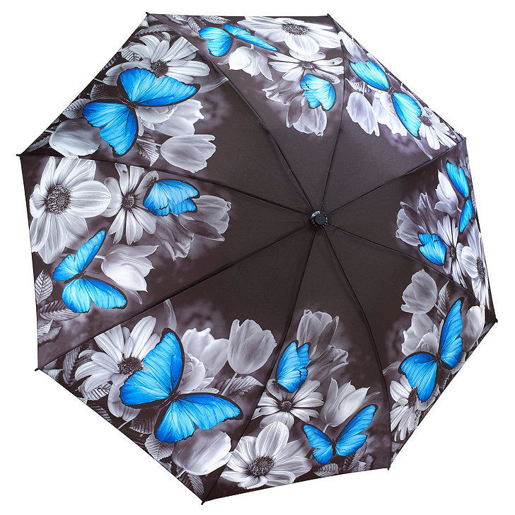 This striking Butterfly umbrella features a floral and rich blue morpho butterfly design you'll love! Our Blue Morpho Butterfly folding umbrella has an auto open/close umbrella button and folds to a compact size yet has a full-size canopy! It makes a great gift for butterfly lovers and comes packaged in a gift box.