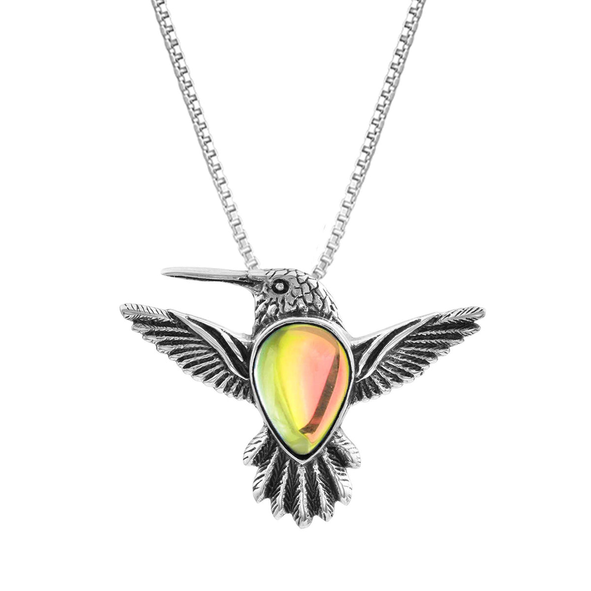 Our artist designed iridescent fire crystal sterling silver hummingbird necklace is handcrafted in the U.S.A.