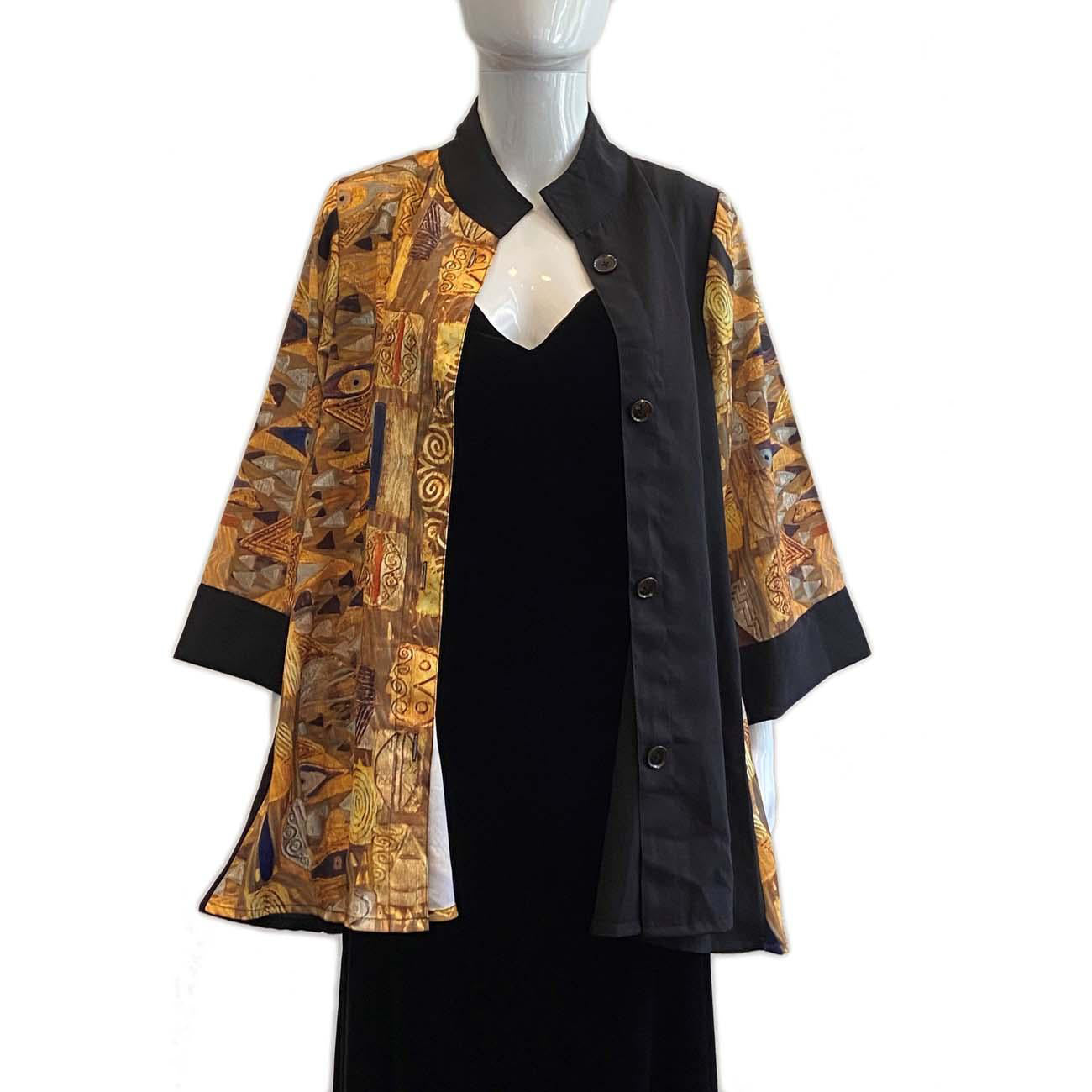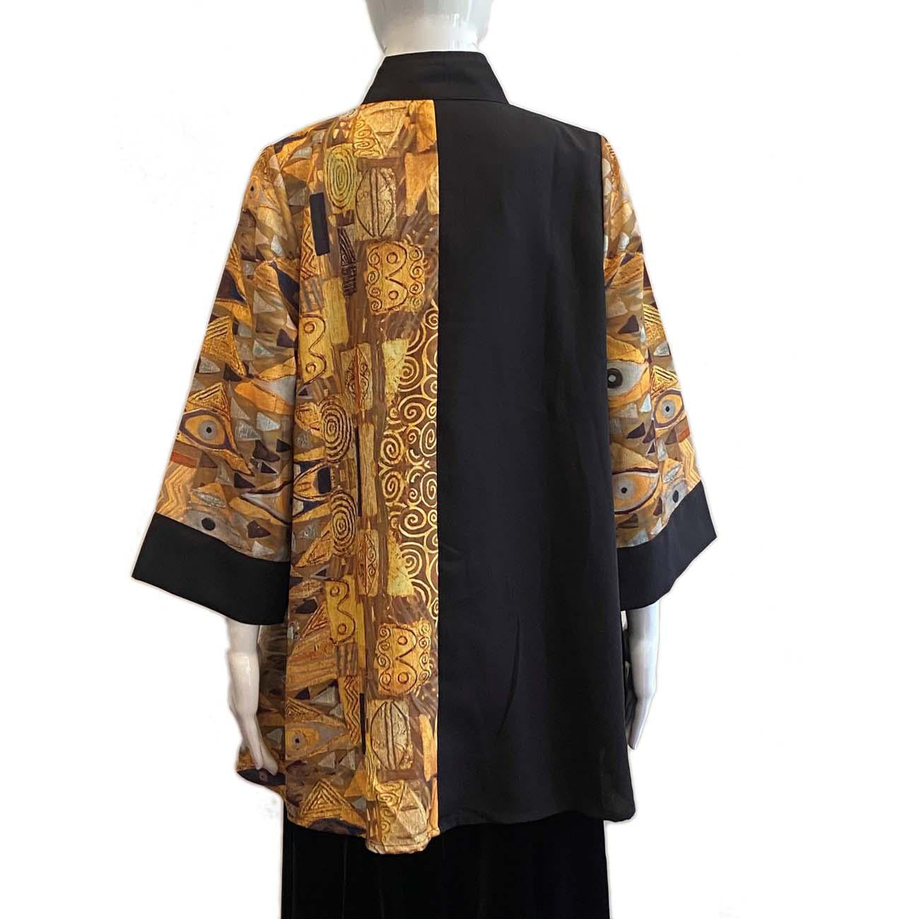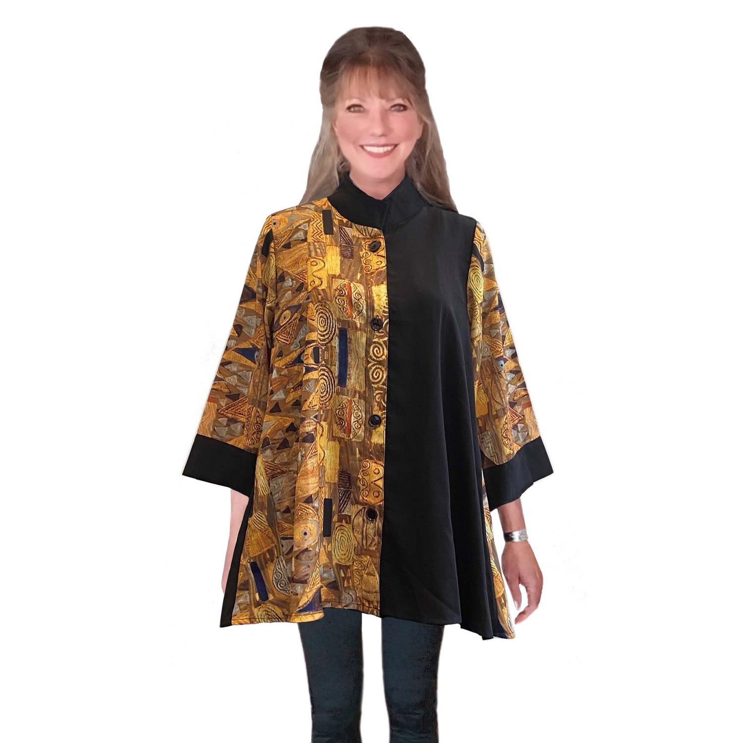 Our Klimt Gold Dress Museum Art Top by Breeke features a detail of Klimt's famous Portrait of Adele Bloch Bauer done during his infamous Gold Period. This beautiful art top can be worn as a shirt or jacket and is made from 100% Polyester fabric with a soft feel and subtle drape. It has an over-sized banded collar, banded 3/4 length sleeves, deep side seam pockets, a flared hem, and full button front. This Kandinsky art top is super versatile, it can be worn as a shirt or a jacket and the size range will allow for a shirt or sweater to be worn underneath!