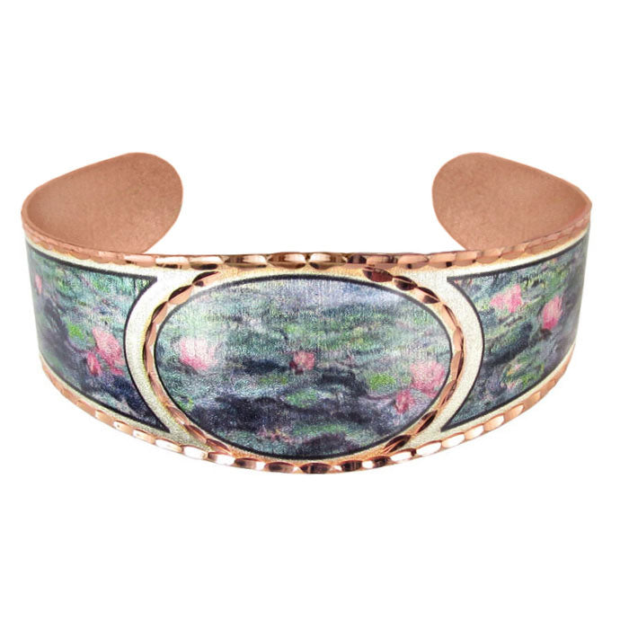 Monet produced many Water Lilies paintings and these earrings feature a beautiful version with pink lilies surrounded by soft greens and blues. This lovely painting has been beautifully reproduced on lightly textured long copper earrings which has a soft sheen and diamond cut borders for sparkle and shine. The cut-out creates a modern and classy look. The stainless steel French earring wires are nickel free and a great choice for anyone with metal sensitivities. Matching Bracelets are available for a special Monet jewelry gift set for yourself or your favorite Monet fan.