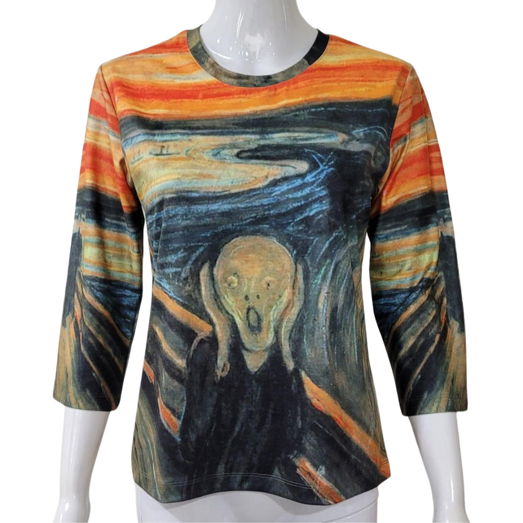 Our new The Scream Shirt is a great art gift for any Munch Fan! This Scream art top is fun and colorful! The scoop neck and slightly fitted cut of this art shirt is flattering to any style figure, the 3/4 sleeves are perfect for most seasons and the ultra soft poly/cotton knit fabric is a joy to wear!
