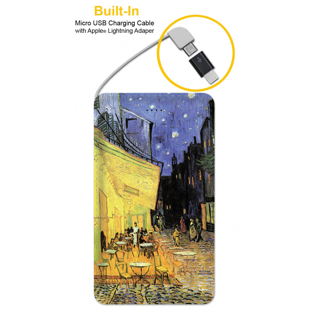 Slim and Powerful Phone or Tablet Charging Power Bank Printed with Van Gogh's Popular Cafe Terrace at Night Painting.
