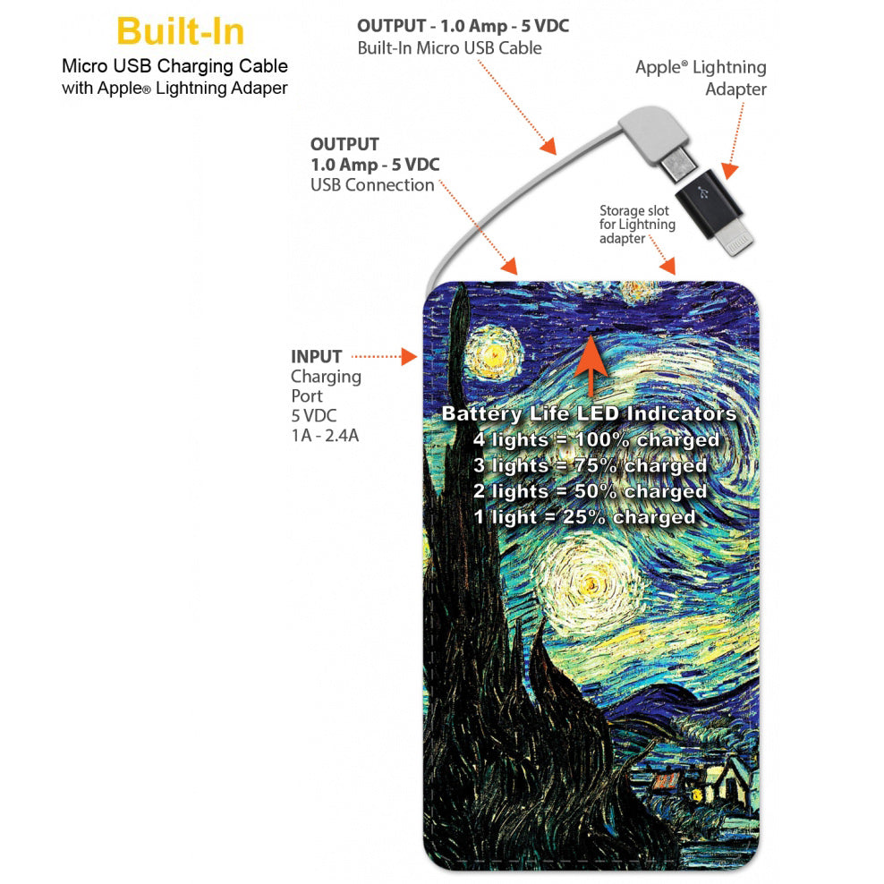 Enjoy your favorite art and keep your cell phone, tablet or other devices charged with our Starry Night Portable Power Bank that neatly fits in a pocket or purse. This This ultra portable power bank will charge your device fast and re-charges in about 3 hours. It has a charge cable, connector, and Lightning adapter which are neatly tucked away, no more losing the charging cable! It has Electrostatic Discharge (ESD) protection, high temperature shut down, input over-current and over-voltage protection, output over-current and over-voltage protection, short-circuit protection, and automatic on / off function.