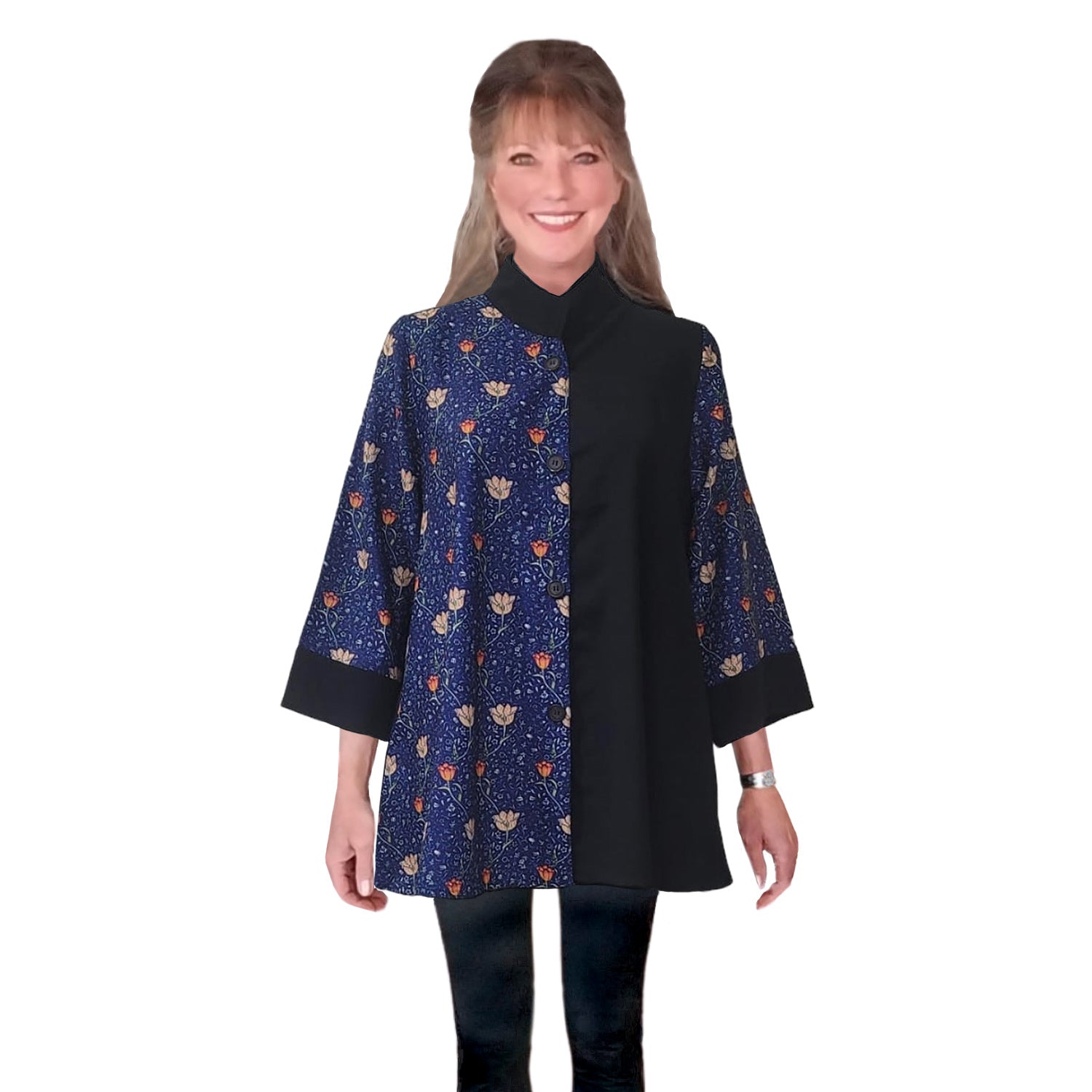 Our William Morris Art Tops by Breeke, feature his beautiful tapestry designs. This beautifully printed art top features a tulip floral print on a rich blue background. Our Breeke swing tops can be worn as a shirt or jacket and they are made from 100% Polyester fabric with a soft feel and subtle drape. Our swing art tops have an over-sized banded collar, banded 3/4 length sleeves, deep side seam pockets, a flared hem, and full button front. This swing floral art top is super versatile, and the size range will allow for a shirt or sweater to be worn underneath!